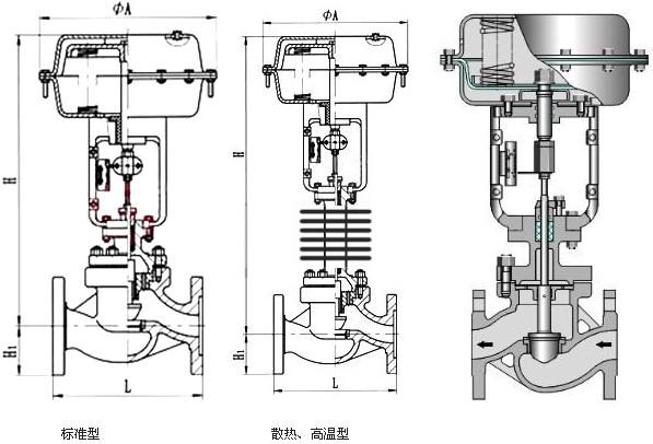 氣動高溫調節閥由氣動多彈簧隔膜執行器和帶高溫翅片的調節閥組成,適用于介質溫度高于250℃的場合。氣動高溫調節閥閥體流道采用S型流線,結構緊湊,重量輕。它具有動作靈敏、壓降損失小、閥門容量大、流量準確、維護方便等優點。它可以在惡劣的工作條件下使用。氣動高溫調節閥廣泛用于精確控制氣體、液體、蒸汽等介質的工藝參數,如壓力、流量、溫度、液位等參數,以維持給定值。氣動高溫調節閥特別適用于泄漏小、閥門壓差小、溫度高的場合。
