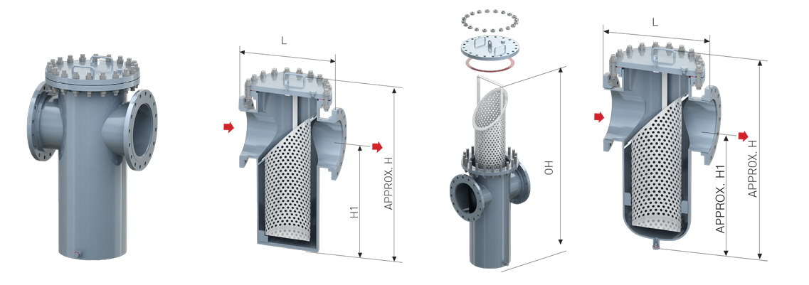 口直通籃式過濾器的進口出口在一個水平位置上,由一個主單筒與進口出口組成,用于攔截管道介質里的雜質。在生產過程中,流體會隨著管道流經過濾器,液體先通過筒體而后進入濾籃,流體從濾籃中流出直至過濾器的出口排出,其中的固體雜質顆粒為濾籃所阻擋,與流體分離完成過濾。過濾器使用一段時間后,固體雜質在濾籃中堆積,這時只要旋開主管底部的螺塞,將直通過濾器內的液體排凈,拆卸法蘭,清洗過濾籃后重新裝入。