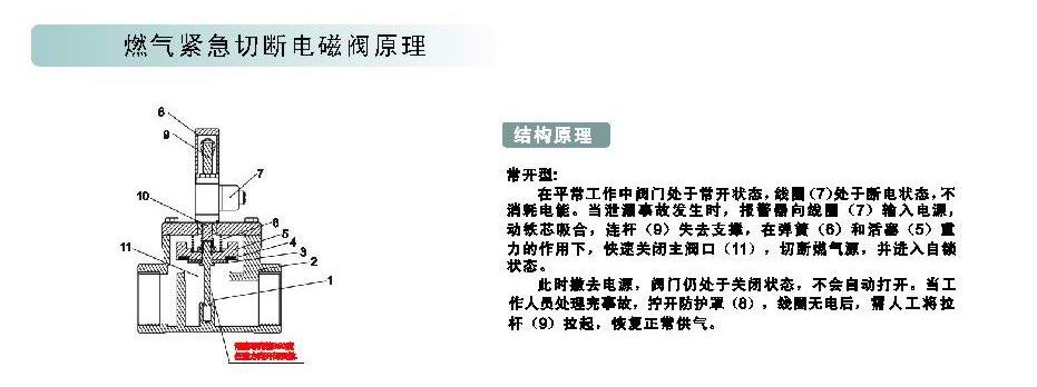 常閉型—在工作狀態中電磁閥處于開啟狀態,線圈不帶電,當發生燃氣泄露時或停電失電時,電磁閥瞬間關閉切斷氣源,但必須在險情排除后,由人工打開電磁閥。
