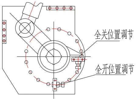(3)蝶閥全開位置的調整(出廠時已調好,如有變動需重調):調整方法見圖(2),先將全開位置調節螺栓向上調節,待蝶板全開(即活塞桿全部伸出到位)后再將螺栓向下調節,頂緊連桿消除機械連接的間隙,然后緊固螺母即可